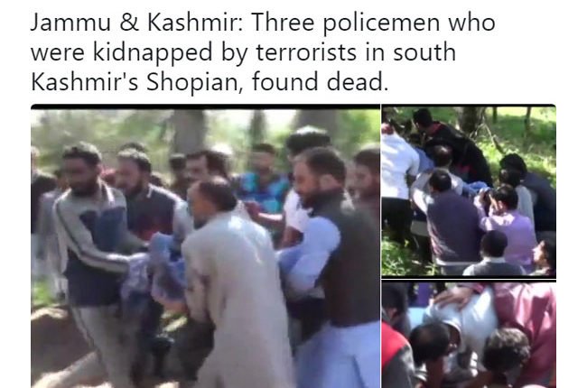 एक बार फिर घाटी में आतंकियों ने स्थानीय पुलिसकर्मियों को अगवा कर उनकी निर्मम हत्या की है।शुक्रवार को शोपियां में चार स्पेशल पुलिस अफसरों (एसपीओ) को किडनैप कर लिया गया