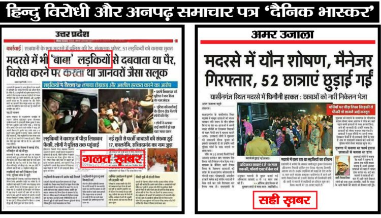 (न्यूज़ लाइव नाऊ) ‘दैनिक भास्कर लखनऊ’ एडिशन में जब बाबा के नाम से एक मदरसे के संचालक की ख़बर लगी तो बहुत से हिन्दू संगठनों ने इसका विरोध किया। नए साल की शुरुआत में ही ‘दैनिक भास्कर’ को सोशल मीडिया में भी ट्रोल होना पड़ रहा है। ‘दैनिक भास्कर’ पर आरोप ये है कि मुस्लिम आपराधिक व्यक्ति को ‘बाबा’ क्यों कहा गया है? क्योंकि आरोप है कि ‘बाबा’ शब्द हिन्दू ‘संतों’ का प्रतिनिधित्व करता है। कुछ लोगों ने कहा कि ‘दैनिक भास्कर’ पैसे बचाने के लिए अनपढ़ पत्रकारों को भर्ती करेगा तो वो ऐसा ही करेंगे। जिनको ये नहीं पता कि बाबा हिन्दू होते हैं और मौलाना मुस्लिम ऐसे लोग कैसे पत्रकारिता करते हैं। एक स्लाइड के ज़रिये, जिसमें ‘अमर उजाला’ में छपी इसी खबर को सही क़रार देते हुए, दोनों समाचार पत्रों की तुलना की गई है। देखिये सोशल मीडिया में क्या लिखा जा रहा है।