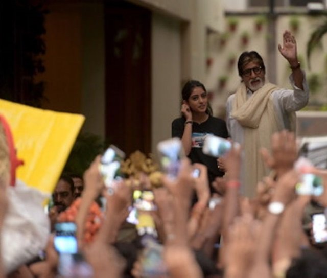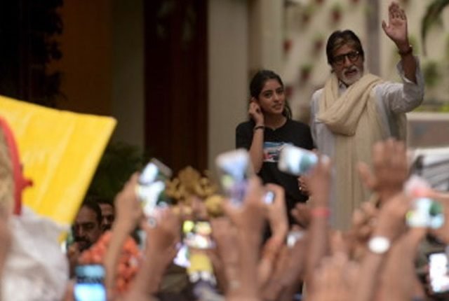 जन्मदिन के मौके पर अमिताभ बच्चन मुंबई स्थित घर जलसा पर फैंस की भारी भीड़ जुटी. हर साल की तरह बॉलीवुड के सुपरस्टार फैंस की इच्छा का ख्याल रखते हुए उनसे मिलने के लिए पहुंचे. इस बार अमिताभ के साथ उनकी नातिन नव्या नवेली भी आई थीं. अमिताभ ने इस पल की तस्वीरों को अपने ब्लॉग पर शेयर किया है. जलसा से बाहर आते ही अमिताभ ने अपने ही अंदाज में हाथ ऊपर करके फैंस का अभिवादन स्वीकार किया. वहां मौजूद लोगों के बीच अमिताभ और उनकी नातिन नव्या की तस्वीर लेने की होड़ मच गई.