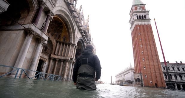 पानी में डूबा ऐतिहासिक वेनिस शहर।