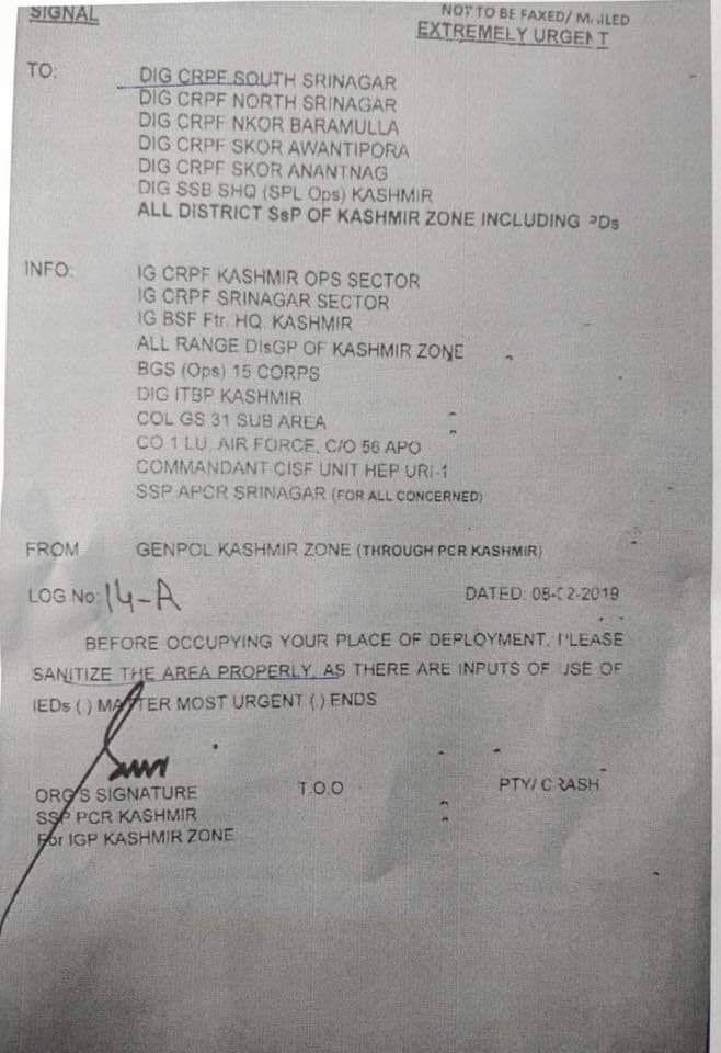 (एनएलएन मीडिया – न्यूज़ लाइव नाऊ) : जम्मू कश्मीर के पुलवामा में हुए सबसे बड़े आतंकी हमले में नए नए खुलासे हो रहे हैं। अब पता चला है कि खुफिया विभाग ने 8 फरवरी को ही जम्मू कश्मीर पुलिस को अलर्ट कर दिया था कि आतंकी आईईडी विस्फोट को अंजाम दे सकते हैं। इस संबंध में एक चिट्ठी 8 फरवरी को भेज दी गई थी। इसकी कॉपी आप यहां भी देख सकते हैं। इसमें लिखा गया है, किसी भी जगह तैनाती से पहले उस जगह की अच्छी तरह से जांच कर लें क्योंकि आईईडी ब्लास्ट के इनपुट्स हैं। (मैटर मोस्ट अर्जेंट)ये चिट्ठी डीआईजी सीआरपीएफ दक्षिण कश्मीर, डीआईजी सीआरपीएफ उत्तरी कश्मीर, सभी एसएसपी को भेजी गई थी। लेकिन लगता है कि इन इनपुट पर ध्यान नहीं दिया गया और आतंकियों इतने बड़े हमले अंजाम दे डाला। बता दें कि जम्मू-कश्मीर में सुरक्षा बलों पर अब तक के सबसे बड़े आतंकी हमले में गुरूवार को सीआरपीएफ के 42 जवान शहीद हो गए। जबकि कई के घायल होने की सूचना है। घटना जम्मू-श्रीनगर नेशनल हाईवे पर दोपहर बाद सवा तीन बजे की है। फिदायीन हमलावर ने विस्फोटक भरी कार को काफिले की बस से टकरा दिया, जिससे विस्फोट में बस के परखच्चे उड़ गए। चारो ओर बस के टुकड़े तथा मलबा पड़ा नजर आ रहा था। आतंकी संगठन जैश ए मोहम्मद ने हमले की जिम्मेदारी ली है। सीआरपीएफ का 78 वाहनों का काफिला 2500 जवानों को लेकर जम्मू से श्रीनगर आ रहा था। इनमें ज्यादातर अपनी छुट्टी बिताकर ड्यूटी ज्वाइन करने जा रहे थे। सामान्य तौर पर एक हजार जवान काफिला का हिस्सा होते हैं। जम्मू-श्रीनगर हाईवे पर पुलवामा जिले के लेथपोरा में काफिले को निशाना बनाया गया। पुलिस के अनुसार आत्मघाती वाहन को चला रहे मानव बम की शिनाख्त कर ली गई है। वह पुलवामा जिले के काकापोर का आदिल अहमद था, जो वर्ष 2018 में आतंकी संगठन जैश ए मोहम्मद में शामिल हुआ था।