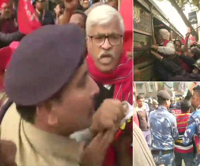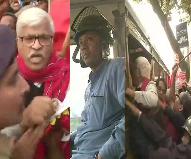 दो दिवसीय देशव्यापी हड़ताल में हिस्सा लेने के लिए पहुंचे सीपीएम नेता सुजान चक्रबर्ती के साथ कई अन्य प्रदर्शनकारियों को हिरासत में लिया गया।