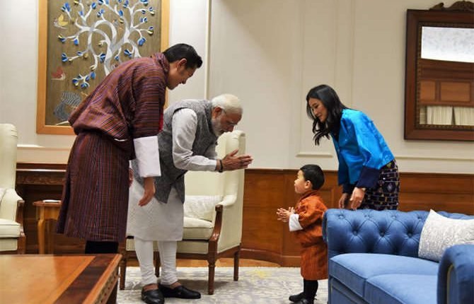 नई दिल्ली.भूटान के राजा जिग्मे खेसर नामग्याल वांगचुक ने बुधवार को फैमिली के साथ प्रधानमंत्री नरेंद्र मोदी से मुलाकात की। इस दौरान वांगचुक की पत्नी और महारानी जेटसन पेमा वांगचुक और प्रिंस ग्यालसे भी मौजूद थे। मोदी ने कपल के साथ आए नन्हे राजकुमार को फीफा अंडर-17 वर्ल्ड कप की एक फुटबॉल और शतरंज गिफ्ट किया। इसके अलावा, विदेश मंत्री सुषमा स्वराज ने भी भूटान के राजा से मुलाकात की और दोनों के बीच अहम मुद्दों पर चर्चा हुई। बता दें कि भूटान की रॉयल फैमिली 4 दिन के दौरे पर भारत आई है।