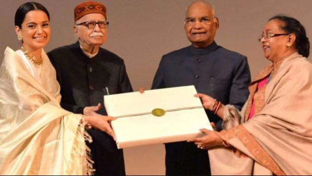 (एनएलएन मीडिया – न्यूज़ लाइव नाऊ) : नई दिल्ली।फिल्म अभिनेत्री कंगना रनौत की बहुचर्चित फिल्म ‘मणिकर्णिका द क्वीन ऑफ़ झाँसी’ राष्ट्रपति भवन में राष्ट्रपति रामनाथ गोविंद को दिखाई गईl शुक्रवार को राष्ट्रपति ने फिल्म देखी और कंगना को सम्मानित भी किया। झांसी की रानी लक्ष्मीबाई के जीवन पर बनी फिल्म ‘मणिकर्णिका द क्वीन ऑफ़ झाँसी’ की स्पेशल स्क्रीनिंग राष्ट्रपति भवन के सांस्कृतिक केंद्र में हुई जहां पर राष्ट्रपति श्री रामनाथ कोविंद ने फिल्म देखी। इस मौके पर फिल्म से जुड़े हुए कलाकार और अन्य सदस्यगण शामिल हुए। खास बात यह रही कि, फिल्म देखने के बाद राष्ट्रपति ने इस मौके पर कंगना रनौत का सम्मान किया। इस अवसर पर प्रसिद्ध गीतकार, लेखक और सेंट्रल बोर्ड अॉफ फिल्म सर्टिफिकेशन (सीबीएफसी) के चेयरमैन प्रसून जोशी और भारतीय जनता पार्टी के वरिष्ठ नेता लाल कृष्ण आडवाणी भी मौजूद थे।