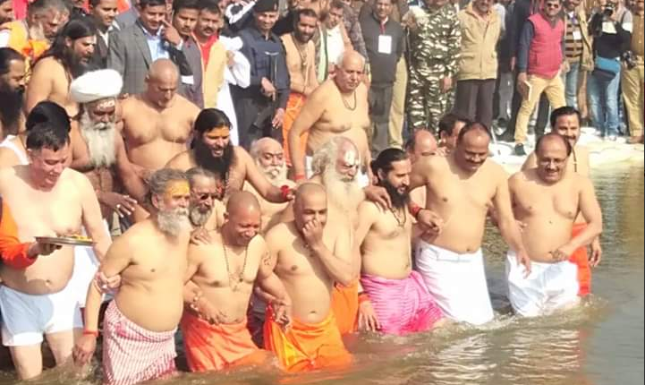 (एनएलएन मीडिया – न्यूज़ लाइव नाऊ) : नई दिल्ली। उत्तर प्रदेश के मुख्यमंत्री योगी आदित्यनाथ ने आज अपनी पूरी कैबिनेट के साथ संगम में डुबकी लगाई। मुख्यमंत्री योगी आदित्यनाथ ने आज पहली बार लखनऊ से बाहर कुंभनगरी प्रयागराज में कैबिनेट बैठक की थी। बैठक के बाद योगी ने अपने पूरे काबीना के साथ संगम में स्नान किया। इस दौरान उनके साथ अखाड़ा परिषद के अध्यक्ष नरेंद्र गिरि और अन्य साधु-संतों ने भी डुबकी लगाई। स्नान के बाद उप मुख्यमंत्री केशव प्रसाद मौर्य ने पत्रकारों से मुखातिब होते हुए कहा कि इसे मैं जीवन का सौभाग्य मानता हूं। आज का दिन प्रयागराज के लिए ऐतिहासिक दिन है। संगम में स्नान से पूर्व योगी पूरे मंत्रिमंडल के साथ संगम किनारे ही स्थित विश्व प्रसिद्ध लेटे हुए हनुमान जी के दर्शन करने पहुंचे। इसके बाद योगी ने अक्षयवट और सरस्वती कूप के भी दर्शन किए। मुख्यमंत्री ने दिव्य कुम्भ, भव्य कुम्भ सेल्फी प्वाइंट पर अपने मंत्रियों के साथ फोटो भी खिंचवाई। इससे पहले कुंभ कैबिनेट में योगी सरकार ने कई बड़े फैसले किए। इसमें योगी सरकार ने मेरठ से प्रयागराज तक गंगा एक्सप्रेस वे बनाने का ऐलान किया। 600 किलोमीटर लंबा यह एक्सप्रेस वे दुनिया का सबसे लंबा एक्सप्रेस वे होगा। गंगा एक्सप्रेसवे छह लेन का होगा। इसे तैयार करने में तकरीबन 36 हजार करोड़ रुपये खर्च होंगे। वेस्ट यूपी के कई इलाके इस एक्सप्रेस वे से जुड़ जाएंगे। इससे पूर्वांचल जाना और आसान हो जाएगा। हालांकि अभी भी भारत में सबसे लंबा एक्सप्रेसवे यूपी में ही है। आगरा से लखनऊ के बीच करीब 302 किलोमीटर लंबा लखनऊ एक्सप्रेसवे है। गाजीपुर से लखनऊ के बीच 341 किलोमीटर लंबा एक्सप्रेसवे अभी प्रस्तावित है। कुंभ में लगातार बड़े नेताओं का आना लगा हुआ है। इससे पहले ही सपा अध्यक्ष अखिलेश यादव ने भी संगम में डुबकी लगाई थी। उन्होंने योगी सरकार पर कटाक्ष करते हुए कहा था कि संगम किनारे कैबिनेट लगाने से भी सरकार लोगों का भला नहीं करने वाली।