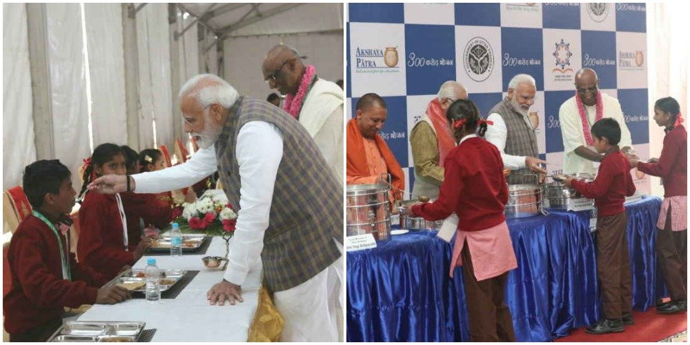 वृंदावन में प्रधानमंत्री मोदी ने बच्चों को परोसी अक्षय पात्र की 300 करोड़वीं थाली