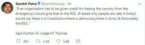 कोट्टायम: सुप्रीम कोर्ट के पूर्व जज ने आरएसएस की तारीफ करते हुए कहा कि संघ जैसी संस्था के कारण ही देश सुरक्षित है। कोट्टयम में संघ के एक कार्यक्रम के दौरान जस्टिस के. टी. थॉमस ने आरएसएस की शान में जमकर कसीदे पढ़े। बीजेपी प्रवक्ता संबित पात्रा ने ट्वीट कर जस्टिस थॉमस के विचार शेयर किए। 80 साल के सेवानिवृत जज के. टी. थॉमस ने अपने संबोधन में कहा, ‘भारतीय संविधान, लोकतंत्र और सेना के बाद आरएसएस ही वह महान संस्था है जिसके कारण देशवासी सुरक्षित हैं।’ इतना ही नहीं थॉमस ने यह भी कहा कि संघ के प्रयासों से ही आपातकाल की गंभीर परिस्थिति से देश बाहर निकल सका।जस्टिस थॉमस ने कहा, ‘संघ की शाखाओं में स्वयंसेवकों को अनुशासन की शिक्षा मिलती है। देश और समाज पर होने वाले आक्रमण के समय संघ के कार्यकर्ता देश की रक्षा कर सकें, इस उद्देश्य से उन्हें शारीरिक प्रशिक्षण भी दिया जाता है। आपातकाल के वक्त संघ की कुशल रणनीति और संगठित प्रशिक्षण का ही प्रभाव था कि तत्कालीन प्रधानमंत्री इंदिरा गांधी को आपातकाल देश से हटाना पड़ा।’ जस्टिस थॉमस 1996 में सुप्रीम कोर्ट के जज नियुक्त हुए थे। 2007 में उन्हें न्यायिक क्षेत्र और सामाजिक सुधारों के लिए उल्लेखनीय योगदान के कारण 2007 में पद्म भूणण सम्मान से भी नवाजा जा चुका है। बता दें कि थॉमस ही वह पूर्व जज हैं जिन्होंने कांग्रेस अध्यक्ष सोनिया गांधी को पत्र लिखकर राजीव गांधी के हत्यारों को माफ करने की अपील की थी।