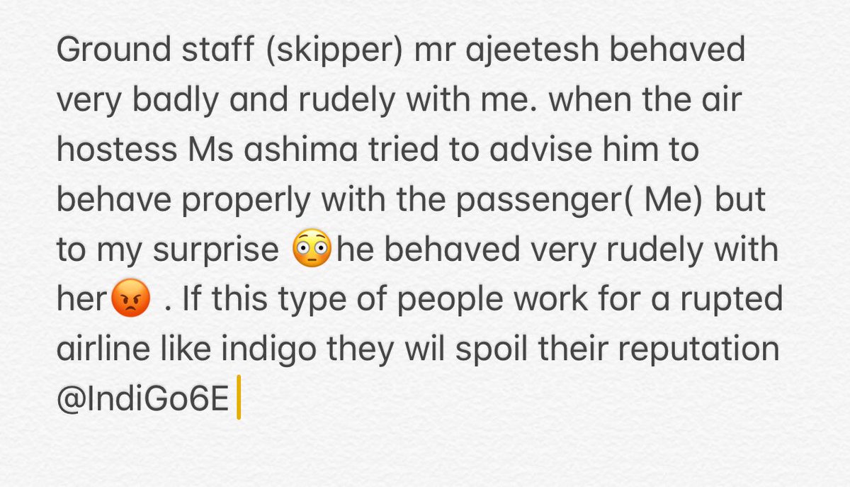 सिंधु के मुताबिक फ्लाइट में मौजूद एयर होस्टेस आशिमा ने उसे यात्री (सिंधु) के साथ ठीक व्यवहार की सलाह भी दी। सिंधु ने बताया कि इसके बाद अजीतेश ने आशिमा के साथ भी दुर्व्यवहार किया। सिंधु ने निराशा जताते हुए लिखा है कि ऐसे लोग इंडिगो की प्रतिष्ठा को नुकसान पहुंचा रहे हैं।