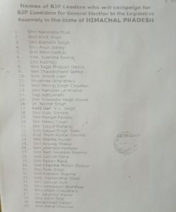 भारतीय जनता पार्टी ने हिमाचल प्रदेश विधानसभा के लिए होने वाले चुनावों में अपने स्टार प्रचारकों की सूची जारी कर दी है। इस सूची में प्रधानमंत्री नरेंद्र मोदी और पार्टी अध्यक्ष अमित शाह सहित गृहमंत्री राजनाथ सिंह, वित्त मंत्री अरुण जेटली, विदेश मंत्री सुषमा स्वराज और परिवहन मंत्री नितिन गडकरी का नाम शामिल है। राज्य में एक ही चरण में 9 नवंबर को वोटिंग होगी और 18 दिसंबर को वोटों की गिनती होगी।