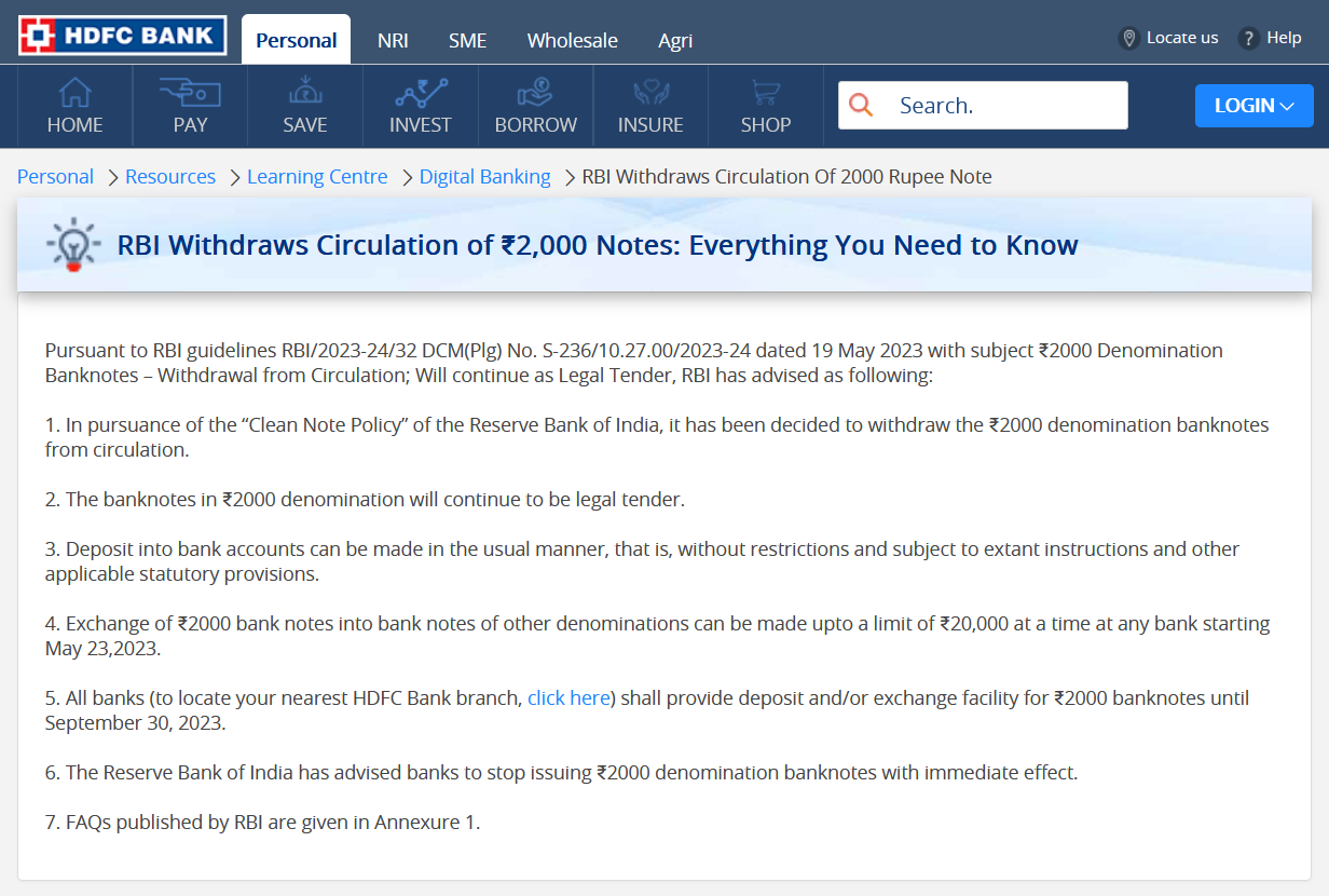 RBI ने पिछले महीने यह घोषणा की थी कि 2000 का नोट चलन से बाहर हो जायेगा, इसलिए जिनके पास भी 2000 का नोट है वे 30 सितंबर तक या तो इसे बैंक में जमा करवा दें या फिर इसे बदल दें. हालांकि ये बैंक नोट वैध मुद्रा (Legal Tender) बने रहेंगे. इसका मतलब है कि अगर आपके पास 2,000 रुपये का नोट है तो उसकी मान्यता बनी रहेगीनोट बदलने की प्रक्रिया 23 मई से शुरू हुई है, जो 30 सितंबर तक जारी रहेगी. बैंक की इसी घोषणा पर HDFC बैंक ने अपने ग्राहकों को सूचित करते हुए कुछ गाइडलाइन जारी किये हैं, जो इस प्रकार हैं-