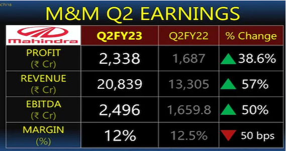 जानकारी के मुताबिक सिंतबर की तिमाही में कंपनी को ऑपरेशन से 29,870 करोड़ रुपये की आय हुई है, जो पिछले साल की इस अवधि के 21,470 करोड़ रुपये दर्ज की गई थी । कंपनी की ओर से जारी जानकारी के मुताबिक महिंद्रा एंड महिंद्रा कंपनी ने स्टैंडअलोन के आधार पर दूसरी तिमाही में 20,839 करोड़ रुपये का रेवेन्यू हासिल किया है, जो पिछले साल के मुकाबले 57 फीसदी तक ज्यादा है । पिछले साल की इस अवधि में कंपनी को 13,314 करोड़ रुपये का रेवेन्यू मिला था । इस साल जुलाई-सितंबर तिमाही में टैक्स हटाने के बाद कंपनी का मुनाफा 46% इजाफे के साथ 2,090 करोड़ रुपये रहा है ।